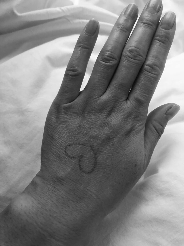 4階に到着すると、執刀する担当女医の先生が、わたしの左手の甲に黒いペンで「マーキングさせてね」と言ってハートマークを書いてくれた。「×って書くのなんかイヤなの」とナースに言う可愛くいう先生が執刀医だなんて、愛を感じる。マーキングというのは、左側を手術しますよ、という印だそうだ。